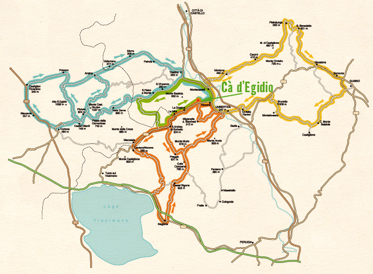 Se amate la vacanza su due ruote lontano dalla frenesia del turismo di massa ed in compagnia dei vostri amici, Cà d’Egidio è il luogo ideale: un casolare immerso nella natura, tra le dolci colline umbre, a pochi chilometri da Città di Castello, dal Lago Trasimeno e da Perugia.